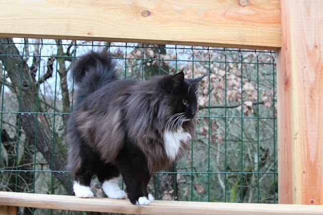 Häxan ou celle que je n'ai pas su laisser partir... elle venait se blottir sur mes genoux chaque fois que j'étais sur l'ordinateur, plantait ses yeux magnifiques dans les miens et ronronnait l'air de dire "Tu me gardes, dis ?" Dans la magnifique portée de Quiroga et Geirrod, j'ai eu un coup de coeur pour son look extraordinaire. Triangle, oreilles, regard, elle a cette expression et cette harmonie magnétiques que je recherche et qui me font chavirer. Elle a pris de sa mère Quiroga sa forme d'oreilles parfaite, de son père Geirrod une super ossature, de sa grand-mère Freya le super front haut et rond, et de ses grand-pères Rob Roy et Murphy LE pompon blanc fétiche ! ... Quant aux yeux, c'est un beau mélange de tous, et c'est le regard hypnotique que j'adore. Selon mon goût à moi, mes envies en élevage, et mon idée du norvégien, cette grande chatte très costaud avec des oreilles fabuleuses et une expression enchanteresse est très proche de mon chat de rêve... Häxan, the one I wasn't able to let go... she came on my knees whenever I was sitting at the computer, she purred and looked at me with her gorgeous eyes, as if she were saying "you won't let me go, right ?" She was born out of Quiroga and Geirrod's beautiful first litter, and I fell in love with her great look. Triangle, ears and eyes are what I love, she has this magnetic expression that I yearn for and that makes my heart melt. She took from Quiroga the beautiful earshape, from her dad Geirrod her super boning, from her grand-mother Freya the high and round forehead, from her grand-dads Murphy and Rob Roy the adorable white spot at the tip of the tail. ... And the eyes, well, they come from all of them, the hypnotic eyes I adore. According to my own taste, to what I dream of breeding, to my idea of the NFO, this big, strong boned girl with fantastic ears and expression is very close to my own personal dream cat... Photos - Mars 2014 - ma belle, belle Häxan avec le papa de sa première portée, mon mâle Troy